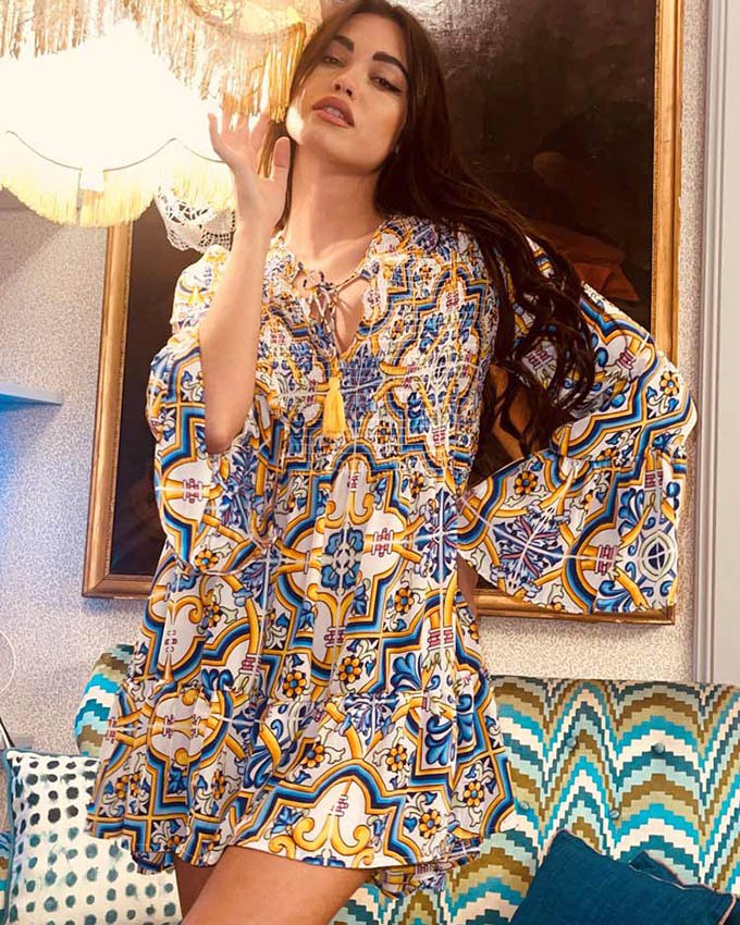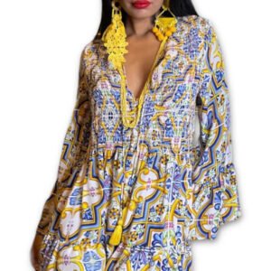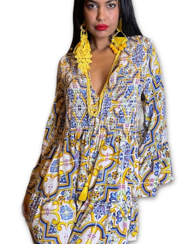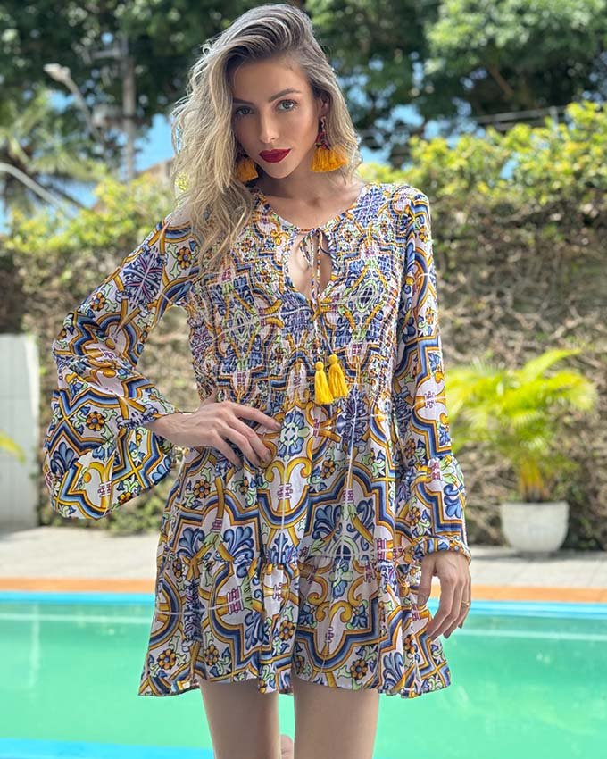 Ela é confeccionado em seda de poliéster estampado, tem busto em lastex aumentando a vestibilidade, mangas largas e em tamanho único