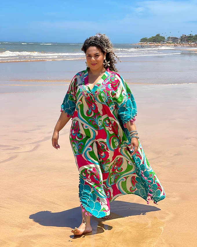 A túnica A3216 da nova coleção Antica sartoria em estilo poncho longo estampado é linda. Bordas com pompons e tassel e finalizando, os bordados lindíssimos feito a mão completam o look. Tamanho único que por ser poncho veste a todas divinamente.